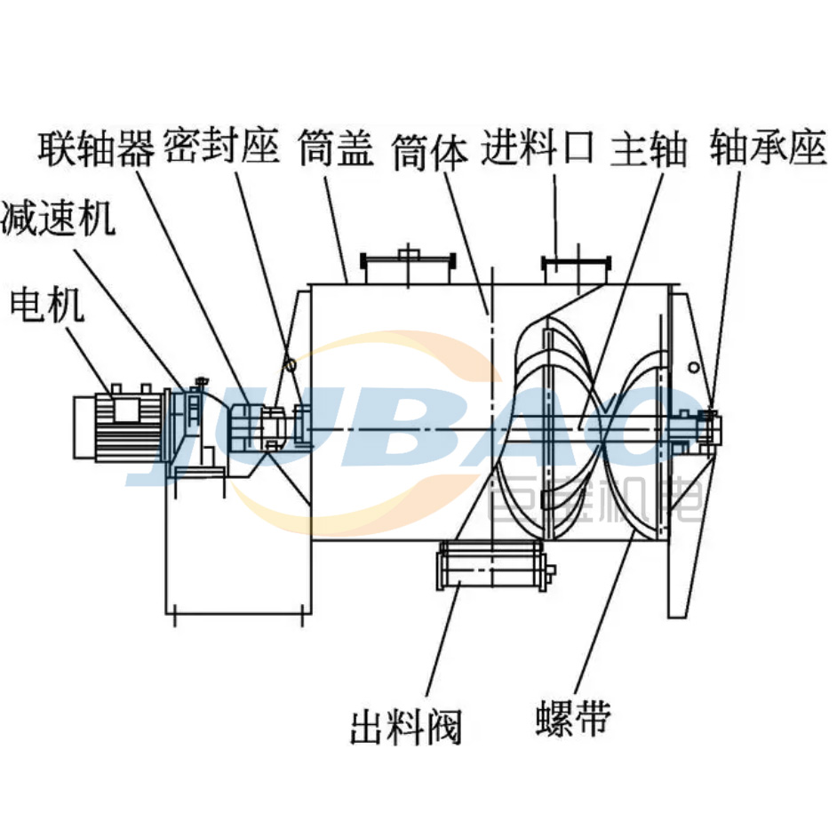 卧式螺带混合机由U形筒体、螺带搅拌叶片和传动部件组成;螺带状叶片一般做成双层,工作时外层螺带将物料从两侧向中央汇集,内层螺带将物料从中央向两侧输送,形成对流混合。搅拌部件还可以制作成桨叶式或增加飞刀,适应不同的物料。筒盖可做成拱形或全开式,拱形可以承压,全开式方便清洗设备内部。