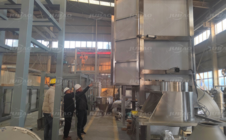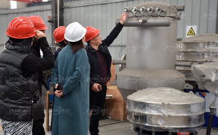 福建某新能源公司客户来厂参观考察,设计团队为其提供负极材料物料从投料-输送-筛分-混合-包装等一体式解决方案。